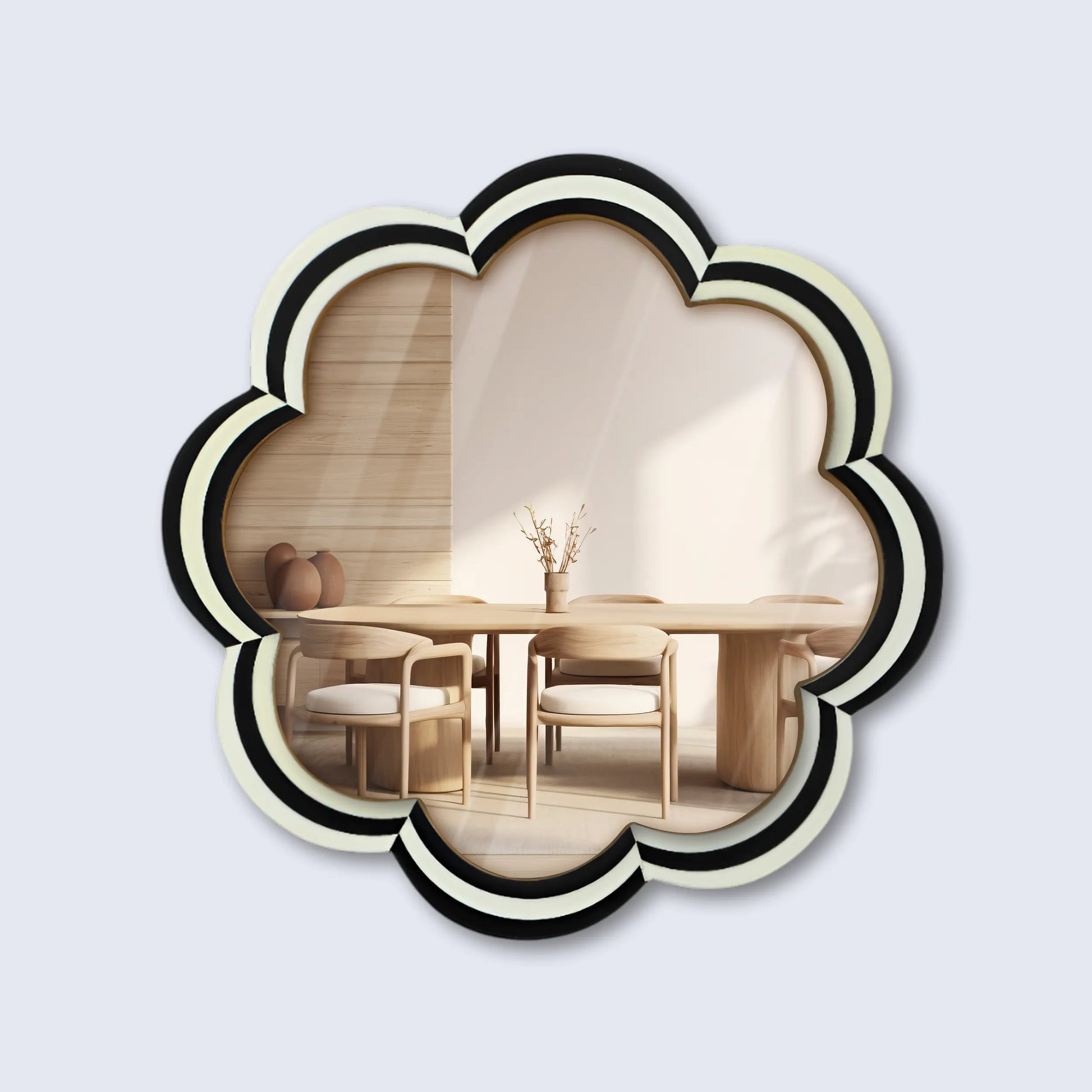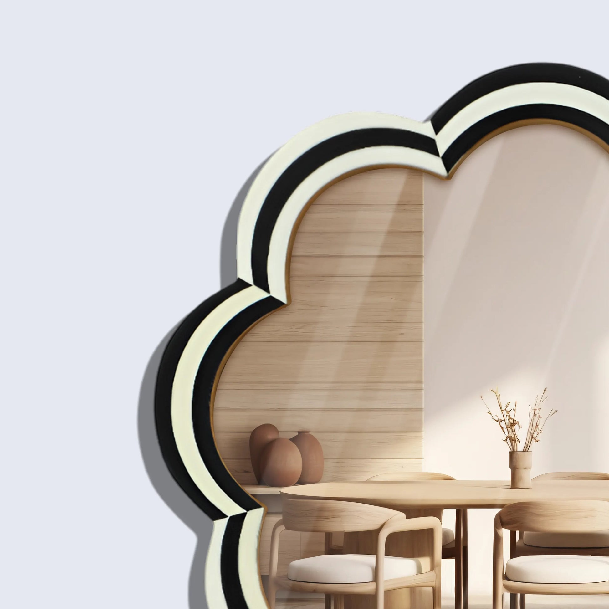 Crafted in a scalloped pattern with black and white bone inlay, this mirror blends traditional craftsmanship with modern elegance. It’s a perfect fit for anyone looking to elevate their home decor with a unique, functional, and visually striking piece. Ideal as a bathroom mirror, make-up vanity mirror, or decorative wall mirror for living room.