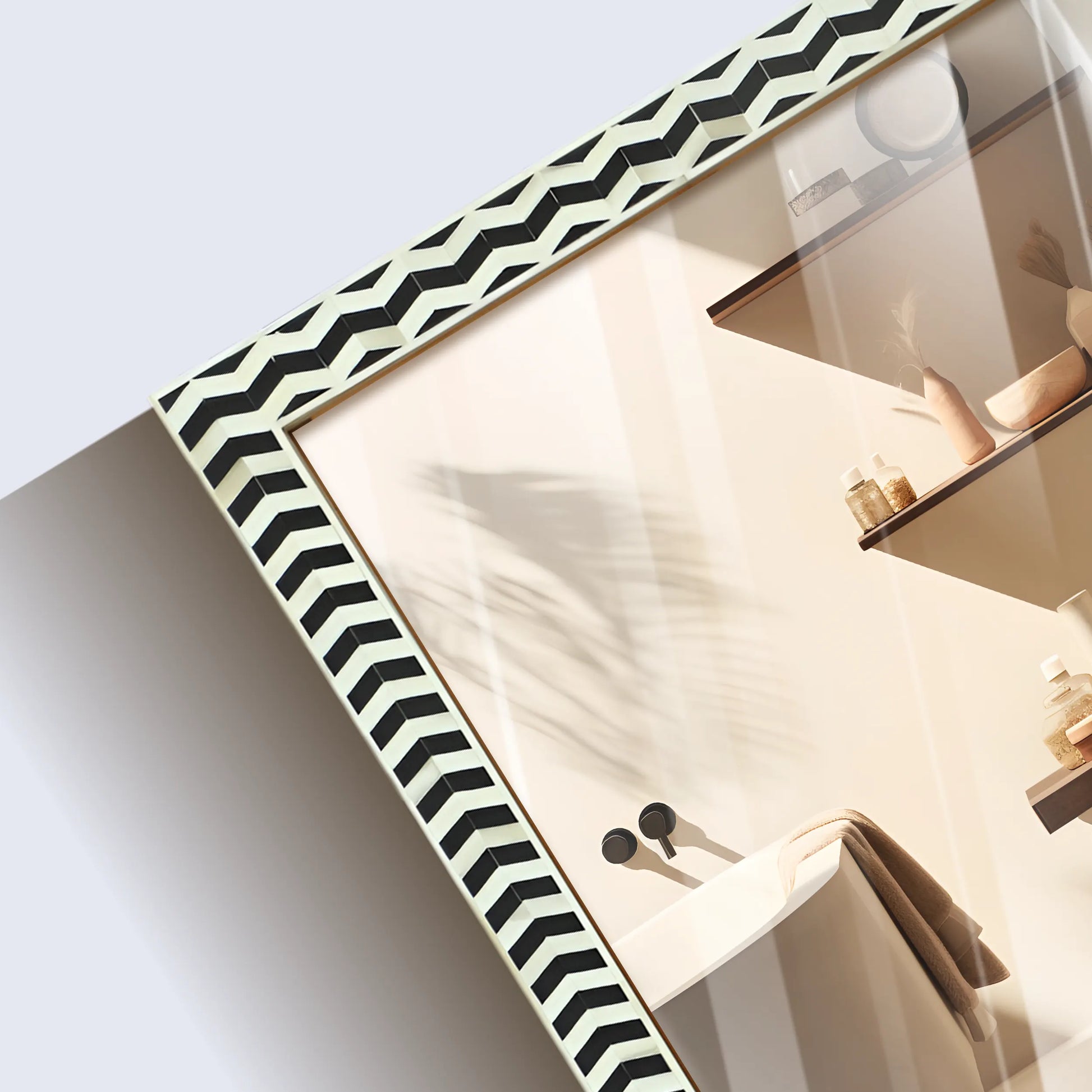 A handcrafted blend of traditional Indian craftsmanship and contemporary herringbone design. Featuring an intricate black and white bone inlay pattern, this artisan-made mirror serves as a functional statement piece that enhances any room with elegance and style. Ideal for use in the bathroom, bedroom, vanity, hallway, or entryway.