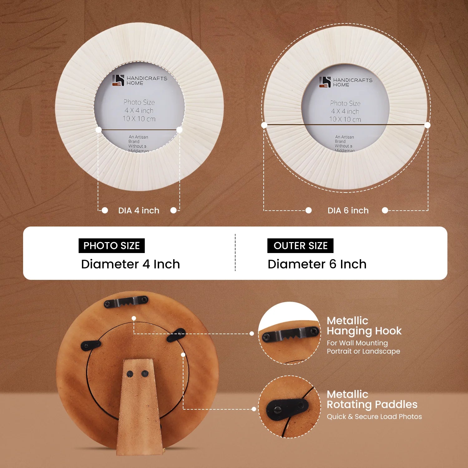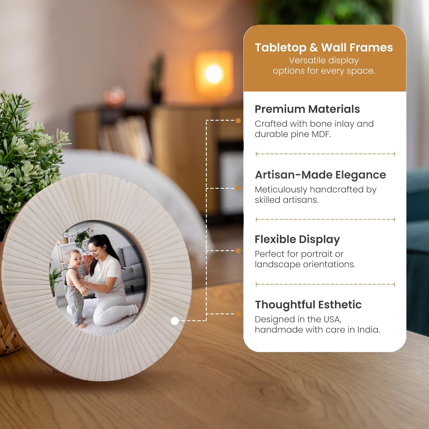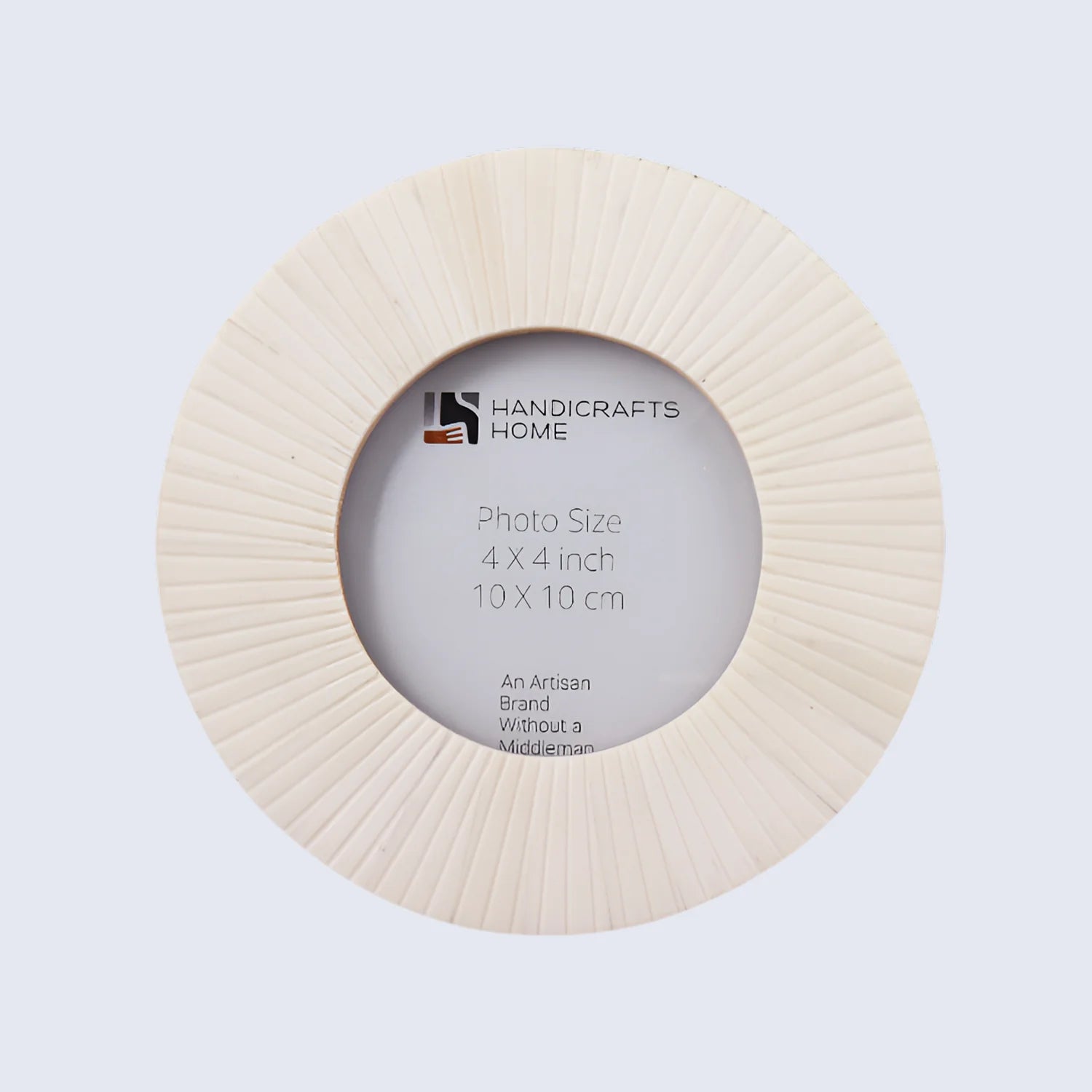 Handmade White Striped 4x4 Round Picture Frame – Bone Inlay Rustic Photo Frame for Tabletop or Wall Display