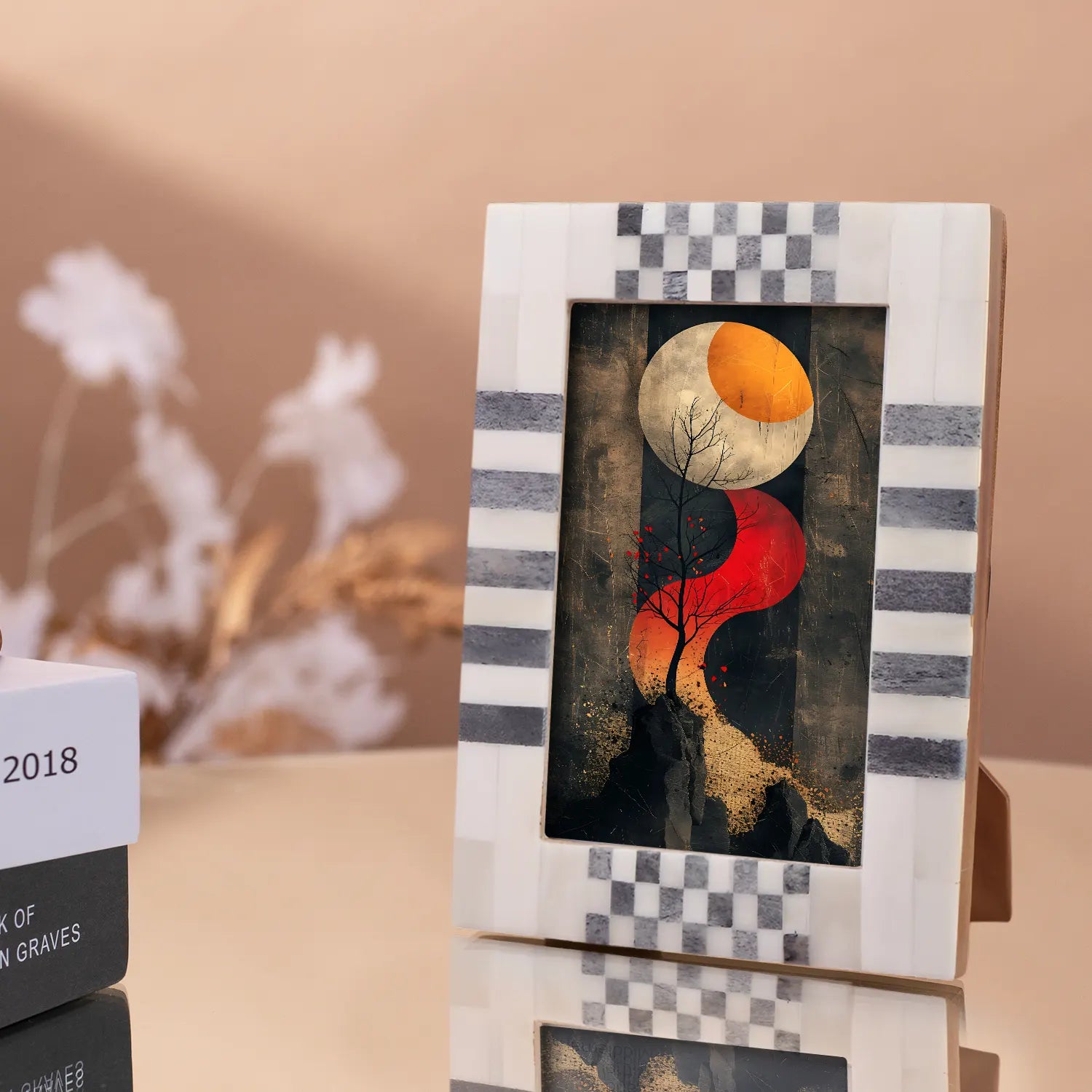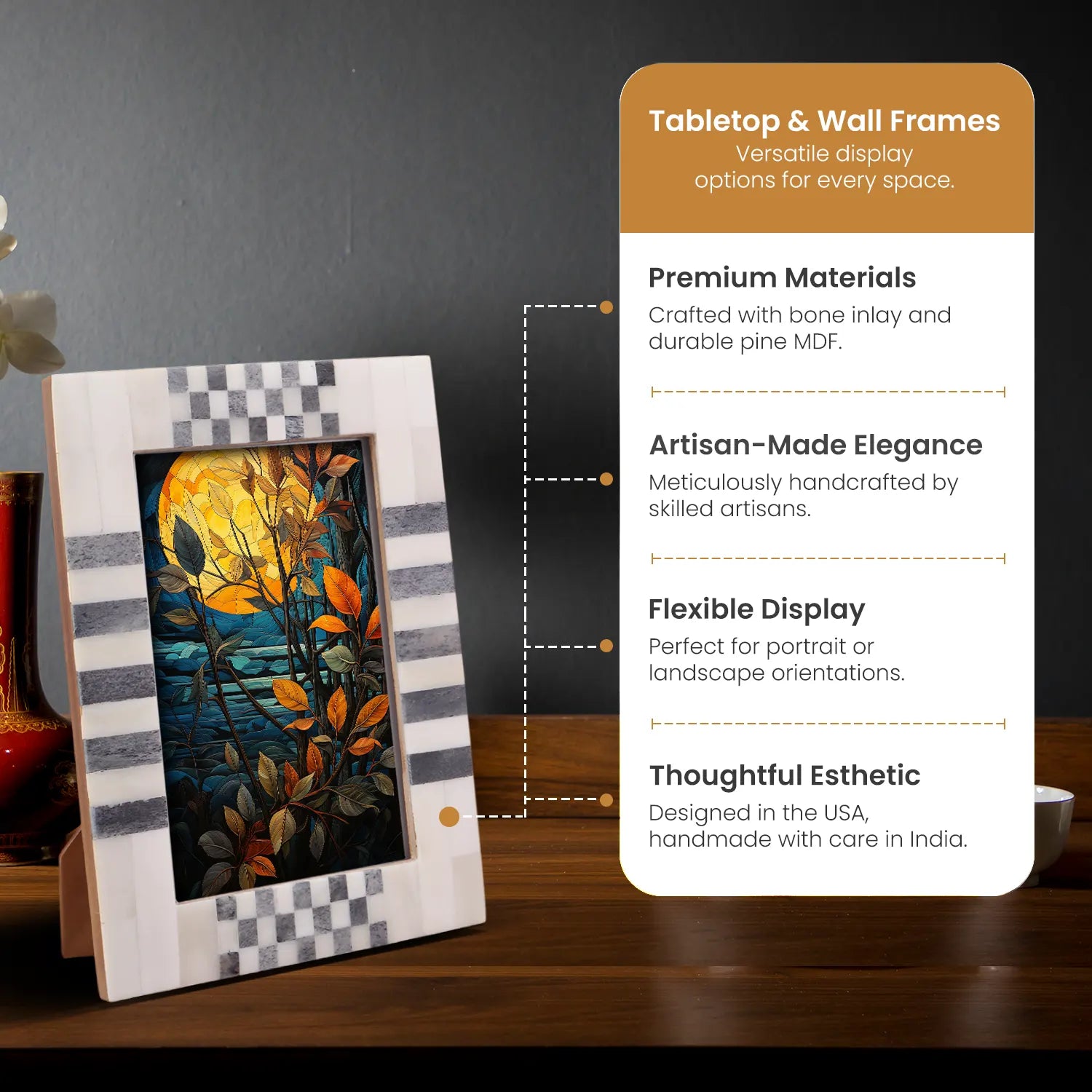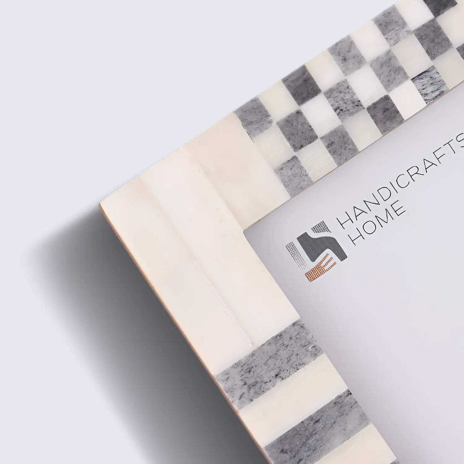 Add refined character to your space with the Handicrafts Home Picture Frame, handcrafted from authentic bone inlay in an elegant striped and checked pattern. Set against a sleek grey and white palette and mounted on sturdy Pine MDF, this frame is a true statement of artisan craftsmanship. Each piece blends traditional techniques with contemporary style—making it a unique and ethical addition to your home decor.