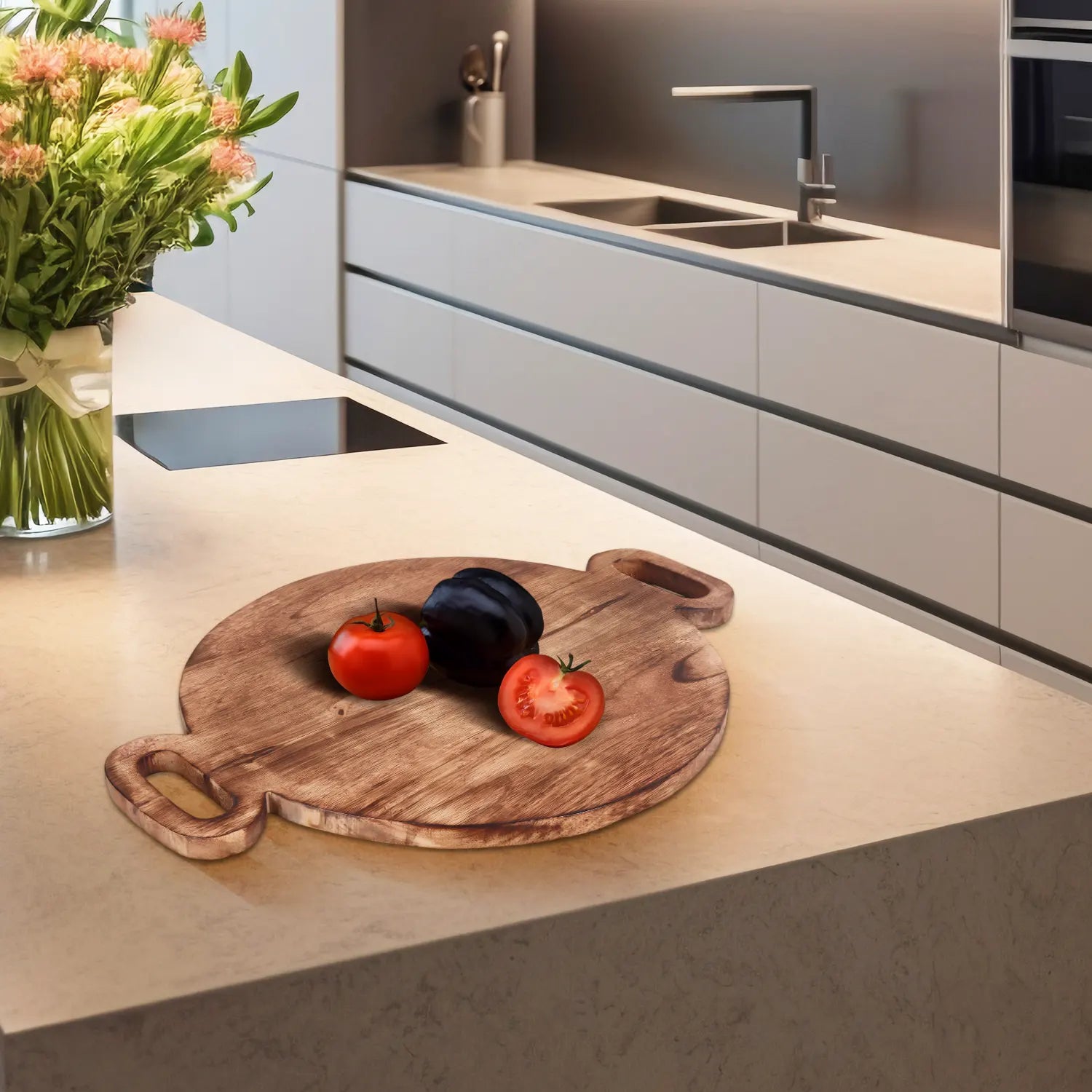 Bring warmth, function, and rustic elegance to your kitchen or dining space with this handcrafted 16x12" Mango Wood Round Paddle Chopping Board / Serving Tray by Handicrafts Home. Whether you're prepping ingredients, plating appetizers, or creating a beautiful charcuterie display, this solid wood board combines timeless design with everyday utility for both home cooks and entertainers.