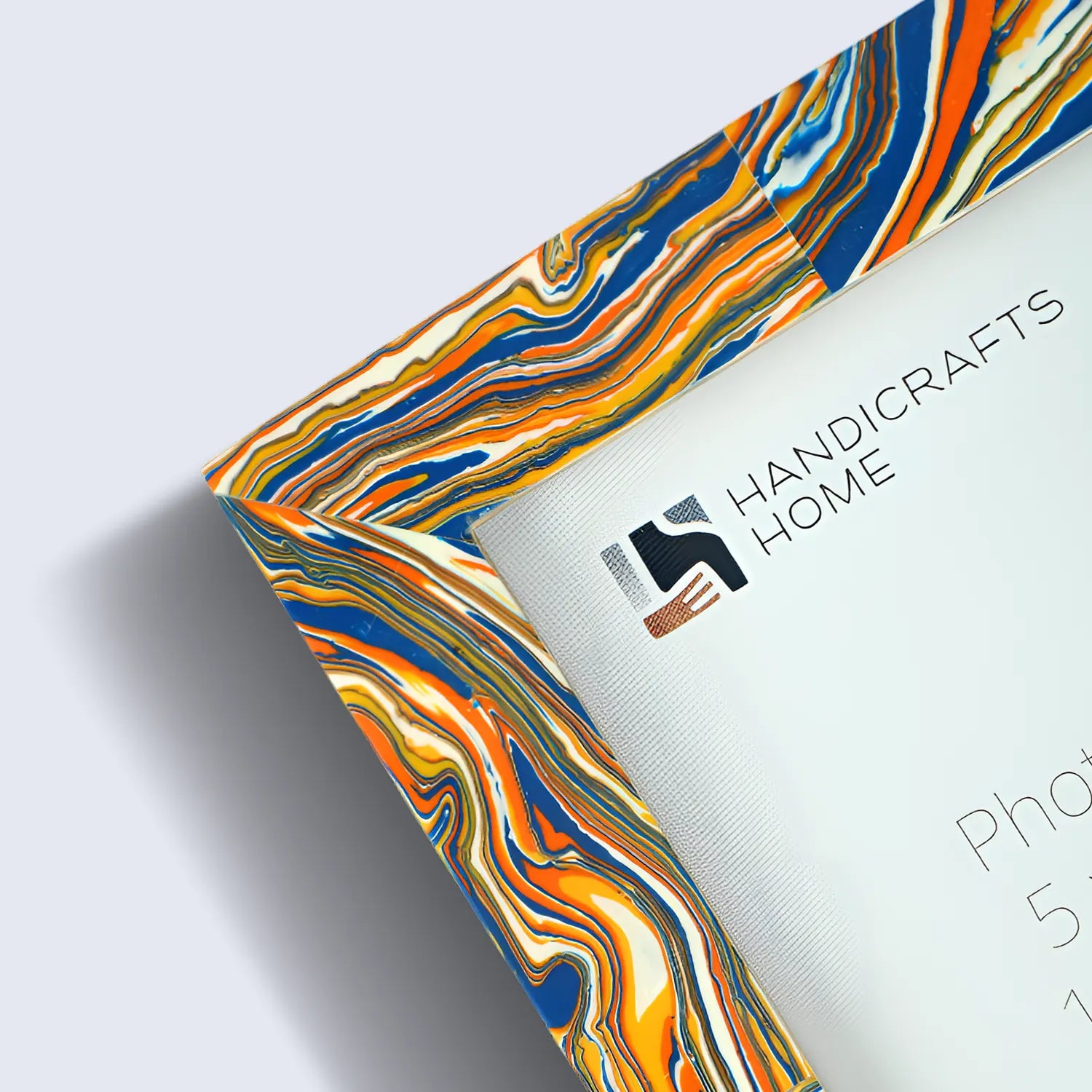 Handicrafts Home Presents Handmade Resin Inlay Colorful Paint Splatter Collection inspired 5x7 Picture Frame. its bold orange, blue, and white swirl design becomes an instant focal point. Whether showcasing family memories, art prints, or certificates, this artisan frame adds a colorful, modern boho touch and makes a perfect gift for any occasion.