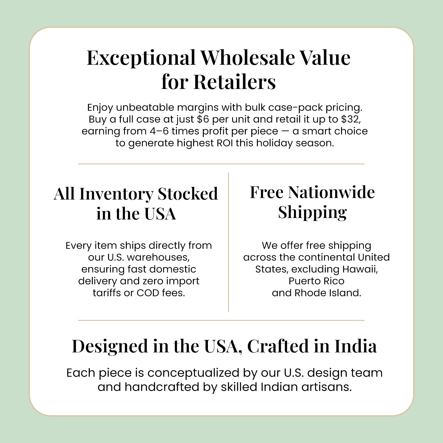 Exceptional Wholesale Value for Retailers – Enjoy unbeatable margins with bulk case-pack pricing. Buy a full case at just $6 per unit and retail it upto $32, earning from 4–6 times profit per piece — a smart choice to generate highest ROI this holiday season.