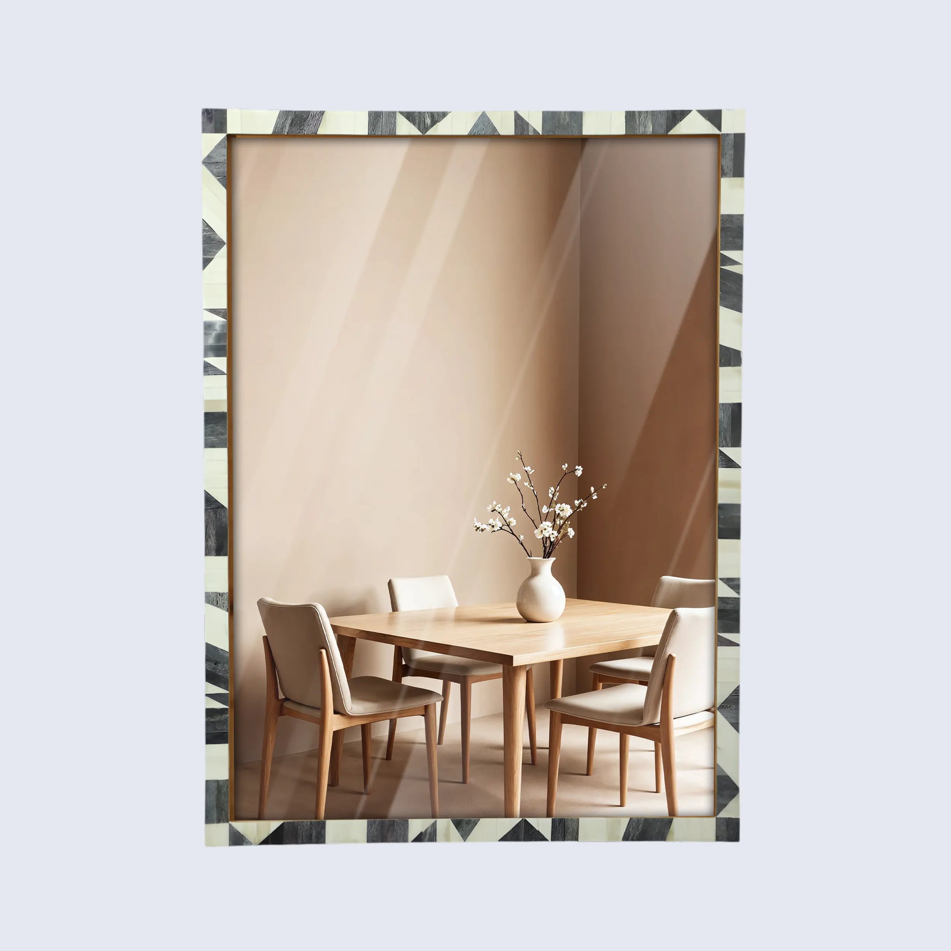 Premium Materials: Expertly constructed using high-quality Bone Inlay and Pine MDF, this mirror offers both durability and artistic charm. The natural bone elements are carefully hand-set, creating a refined, geometric-inspired pattern.