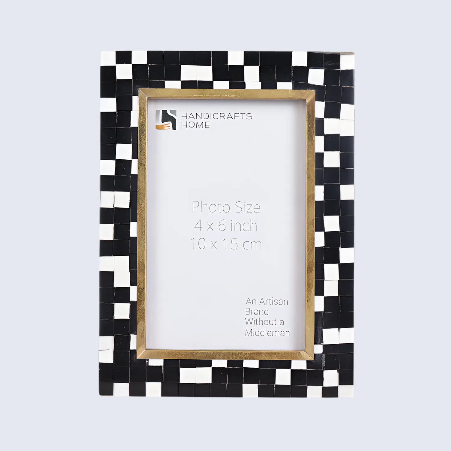An Artisan Brand without a Middleman - Handicrafts Home presents the Halo Mosaic Pattern Inspired Brass & Resin Inlay Picture Frame 4x6. Meticulously handcrafted by skilled artisans, this exquisite frame is created one piece at a time, featuring premium Brass and Resin inlay on durable Pine MDF. The Black & White Mosaic pattern paired with a Gold Inner Border adds a touch of luxury and sophistication to any space.