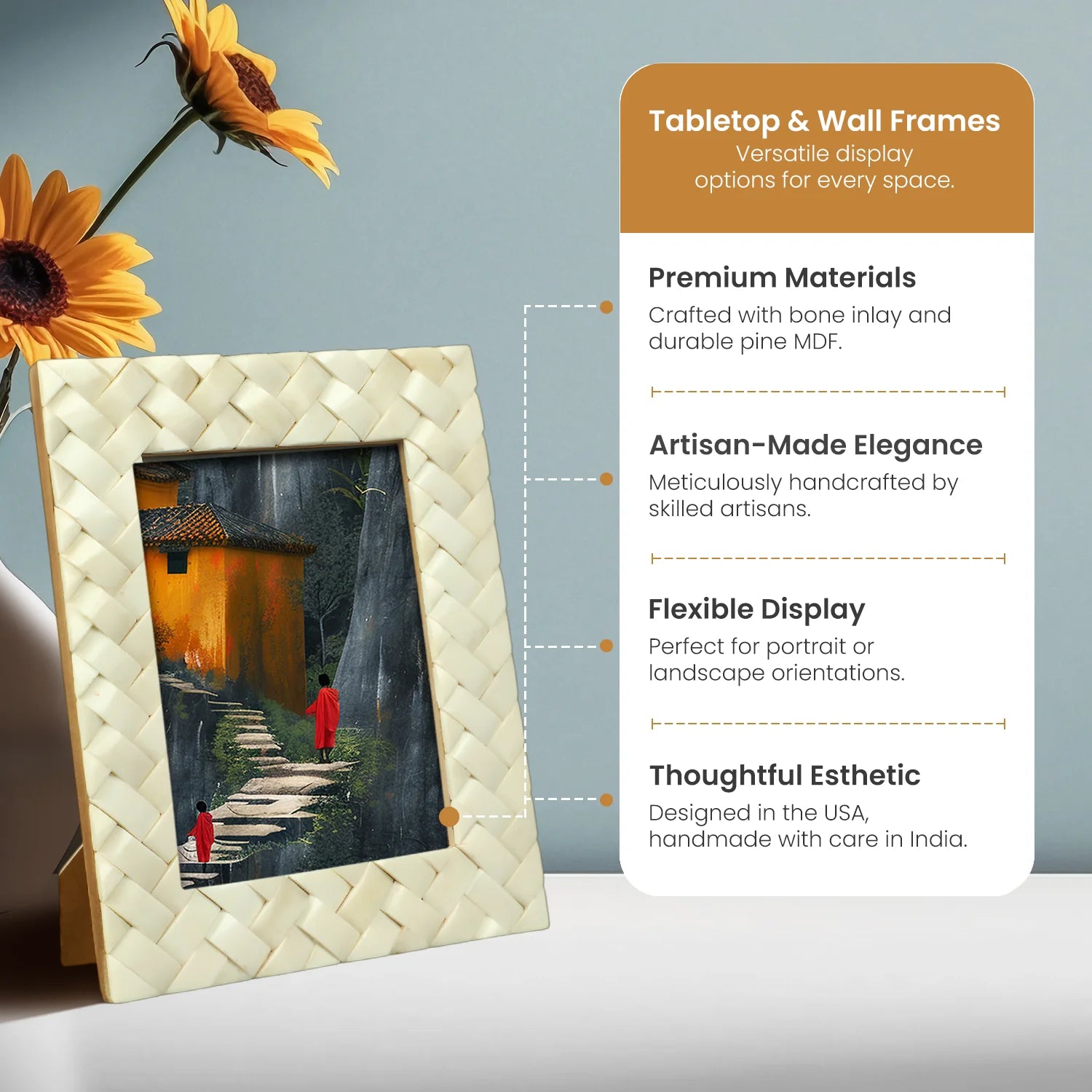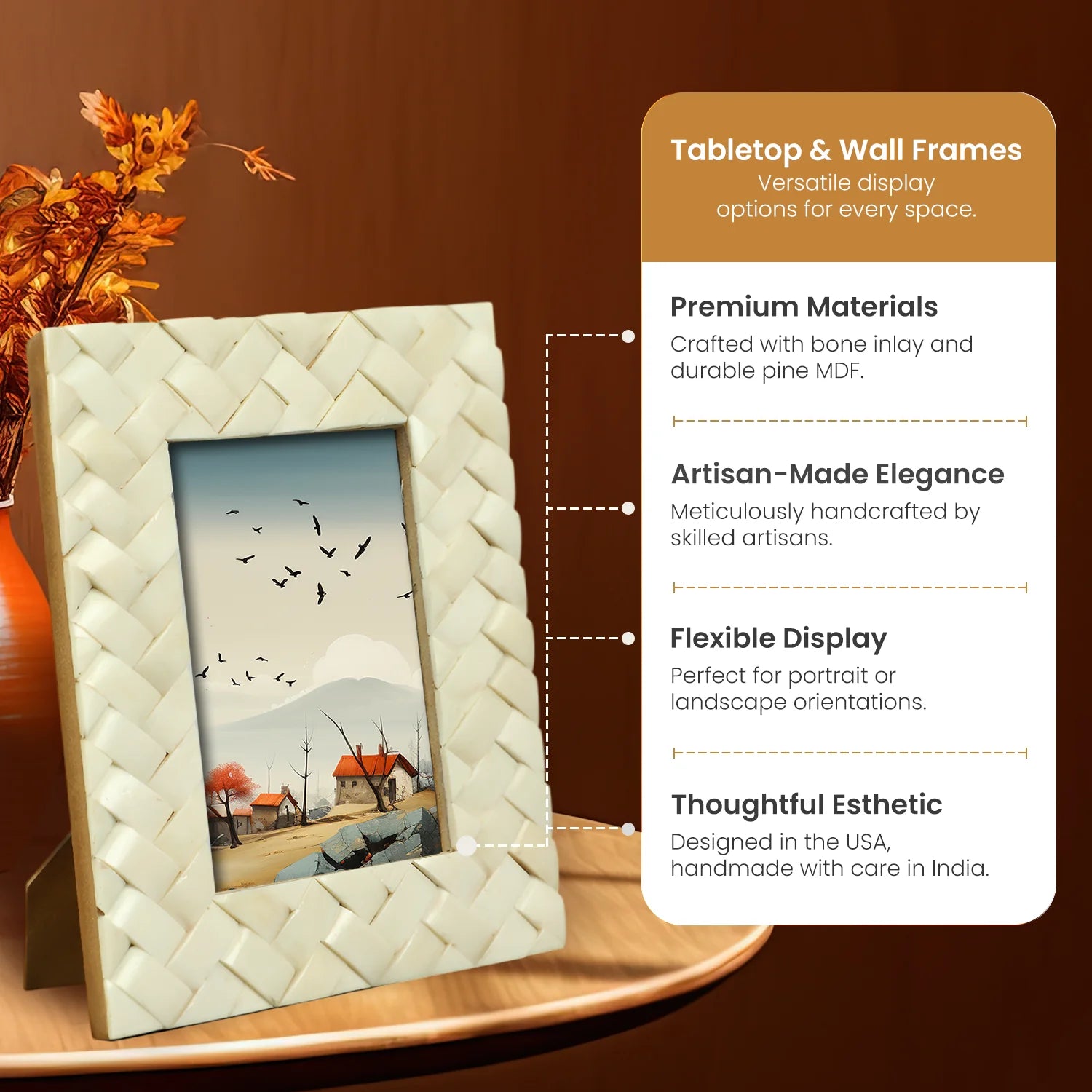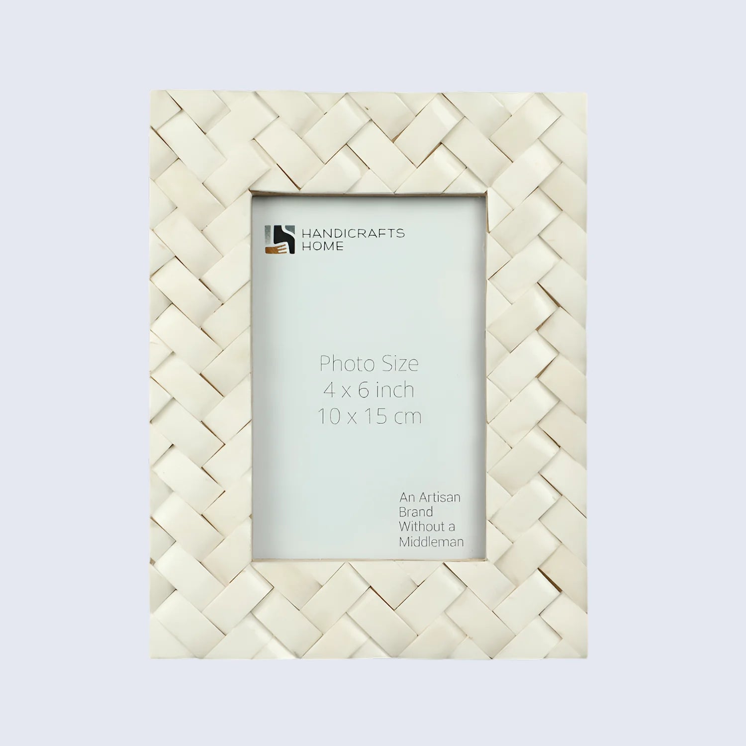 Elevate your space with the Handicrafts Home Picture Frame, featuring a beautiful white bone inlay in a refined braided pattern. Mounted on durable pine MDF, this frame brings together ethical craftsmanship and elegant design—an ideal piece for any modern or classic home.