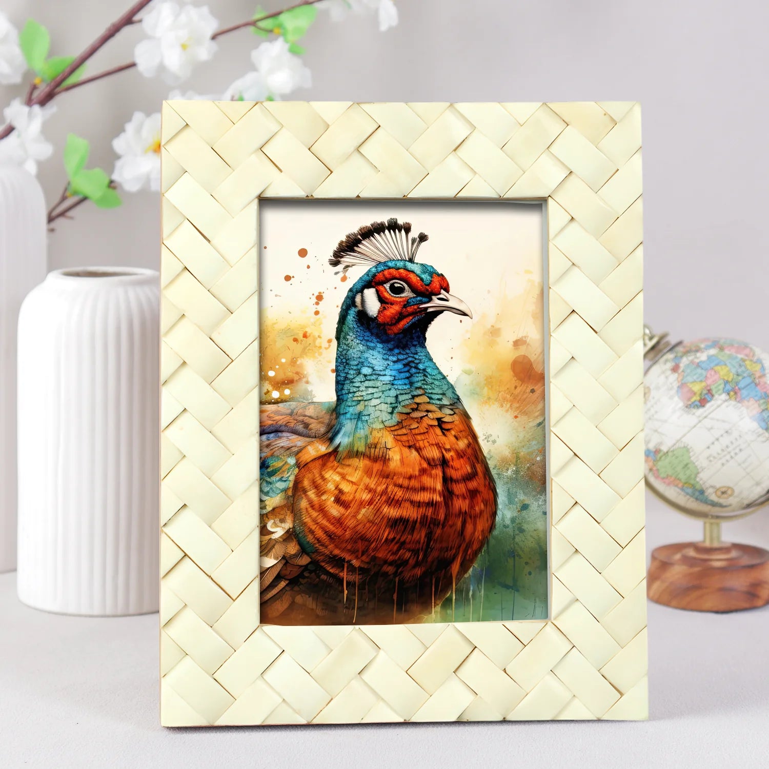 This photo frame features a refined braided bone inlay pattern in a clean white tone, offering a stylish balance of contemporary design and vintage elegance—perfect for modern home decor or a minimalist accent.
